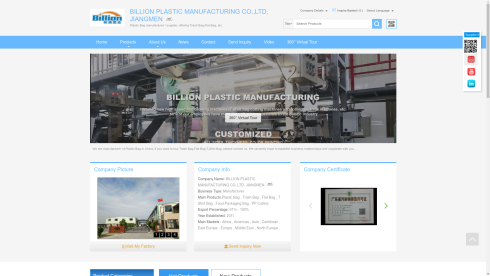 Billion Plastic Manufacturing Co.,Ltd, Jiangmen have been specialized in Plastic Bag manufacture for many years. Our main products are various kinds of Trash Bag, Flat Bag. Also including T-Shirt Bag, etc.
